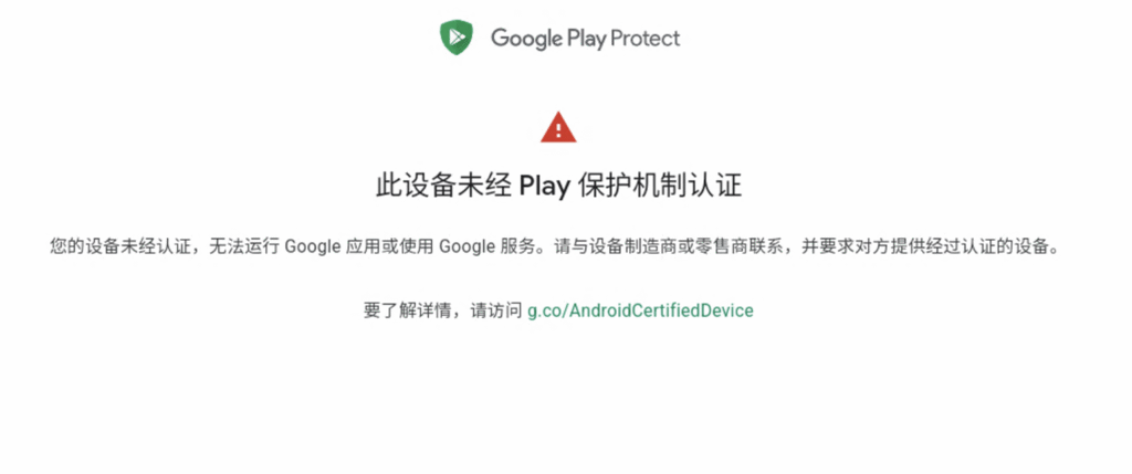 解决方案:访问一次 Google Play 直至出现下图此设备未经 Play 保护机制认证页面再使用官网方案就可以了