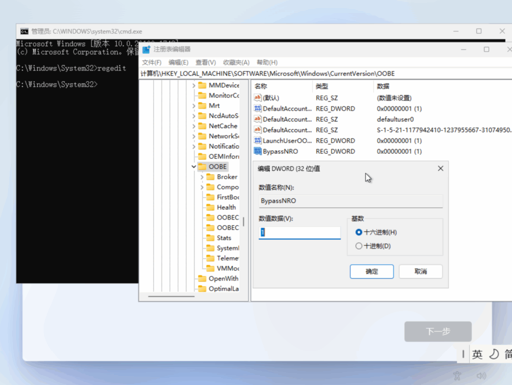在命令行中输入如下命令打开注册表,进入计算机\HKEY_LOCAL_MACHINE\SOFTWARE\Microsoft\Windows\CurrentVersion\OOBE