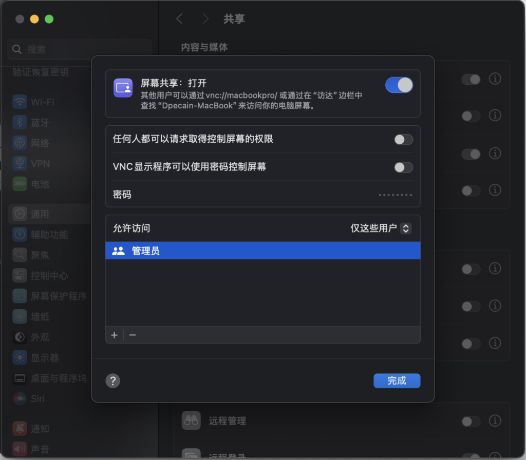 Posted in知识 Windows 11 远程 Mac 15(Sequoia) Posted by By dpecain 2025年4月2日 一、Mac设置 进入设置 – 通用 – 共享 打开屏幕共享 – 根据需求添加允许访问用户 二、Windows设置 登录、下载、安装RealVNC 新建连接 -> 输入Mac IP同一局域网 -> Mac账号密码非Apple ID dpecain View All Posts Post navigation Previous Post Mac 快捷键Next Postamd、amd64、arm、arm64区别